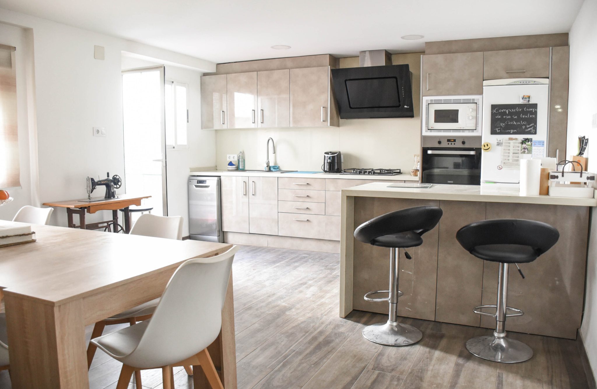 Además, dispone de suelos porcelánicos con efecto madera, paredes alisadas y ventanas de climalit.